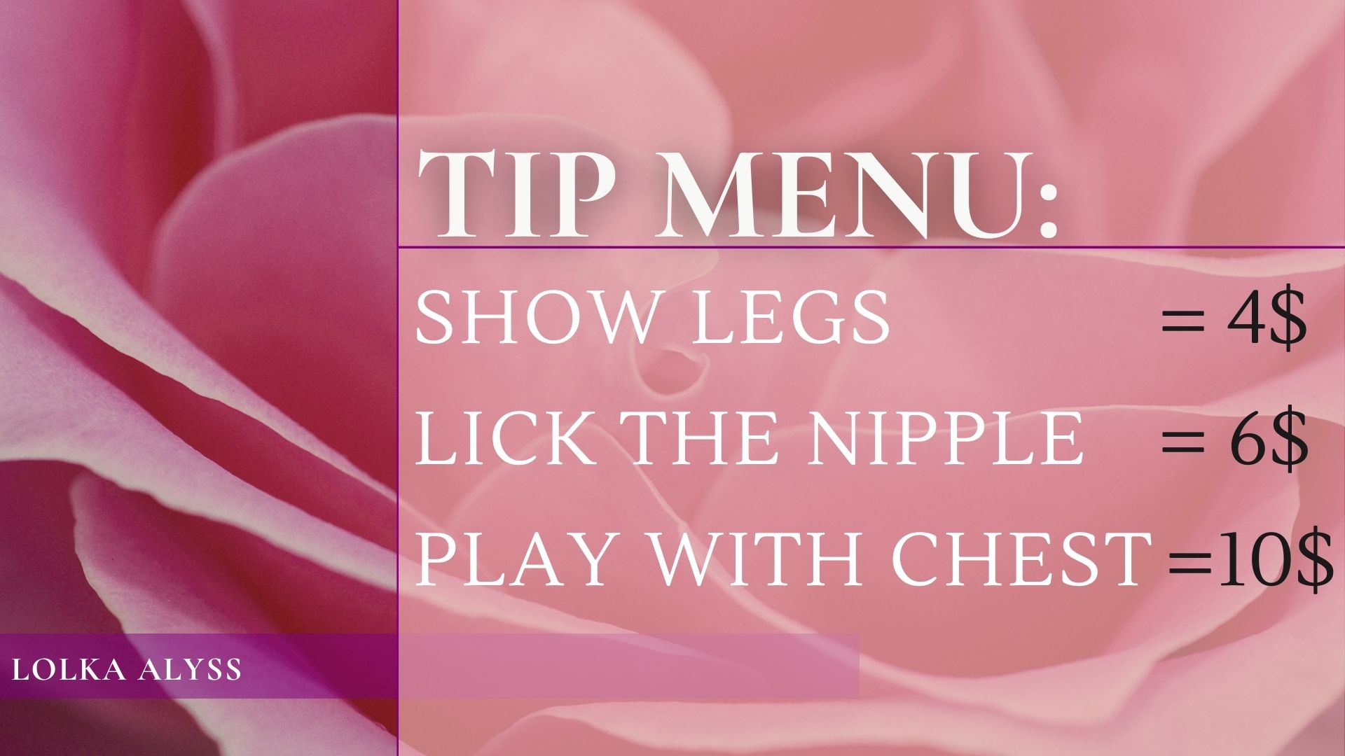 Durch Anklicken des Buttons wirst du LolkaAlyss für 60 Sekunden auf die erste Position auf der Hauptseite befördern. Während dieser Zeit wird der Chat-Raum des Models besser sichtbar und unglaublich populär! Ein Hinweis auf deine Aktion wird im Chat erscheinen, sichtbar für das Model und die anderen Chat-Teilnehmer. LolkaAlyss wird diese Geste sicher zu schätzen wissen und dir unendlich dankbar sein!