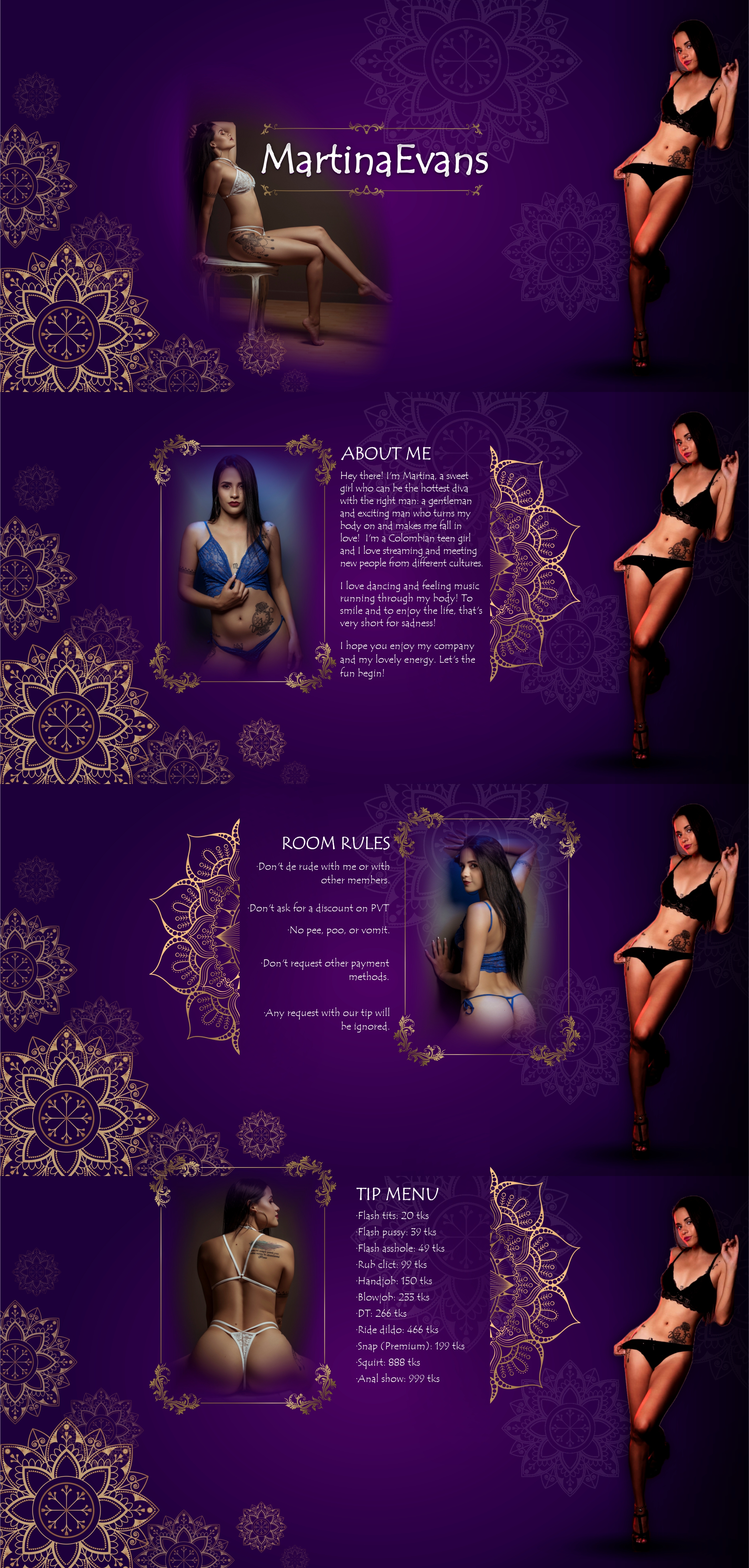 Martina Evans has the looks of the Mona Lisa. Skin so smooth. She treats you right and pays attention to you. I highly recommend this one. Be prepared to be turned on immediately by her. 100% woman.