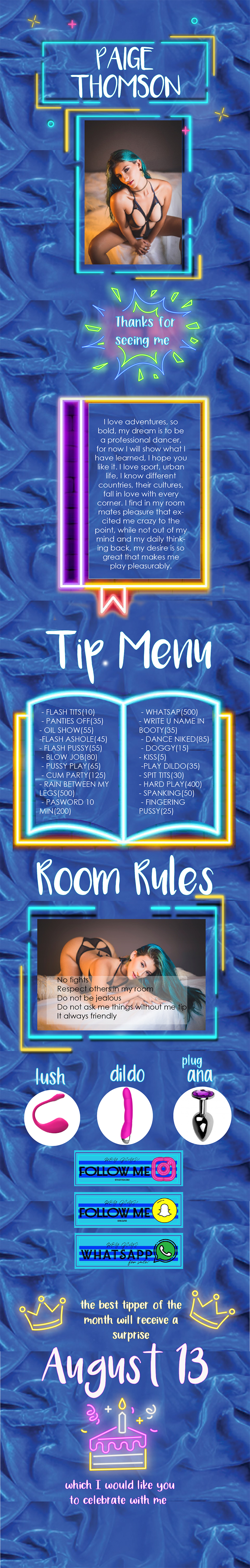 Durch Anklicken des Buttons wirst du PaigeThomson für 60 Sekunden auf die erste Position auf der Hauptseite befördern. Während dieser Zeit wird der Chat-Raum des Models besser sichtbar und unglaublich populär! Ein Hinweis auf deine Aktion wird im Chat erscheinen, sichtbar für das Model und die anderen Chat-Teilnehmer. PaigeThomson wird diese Geste sicher zu schätzen wissen und dir unendlich dankbar sein!