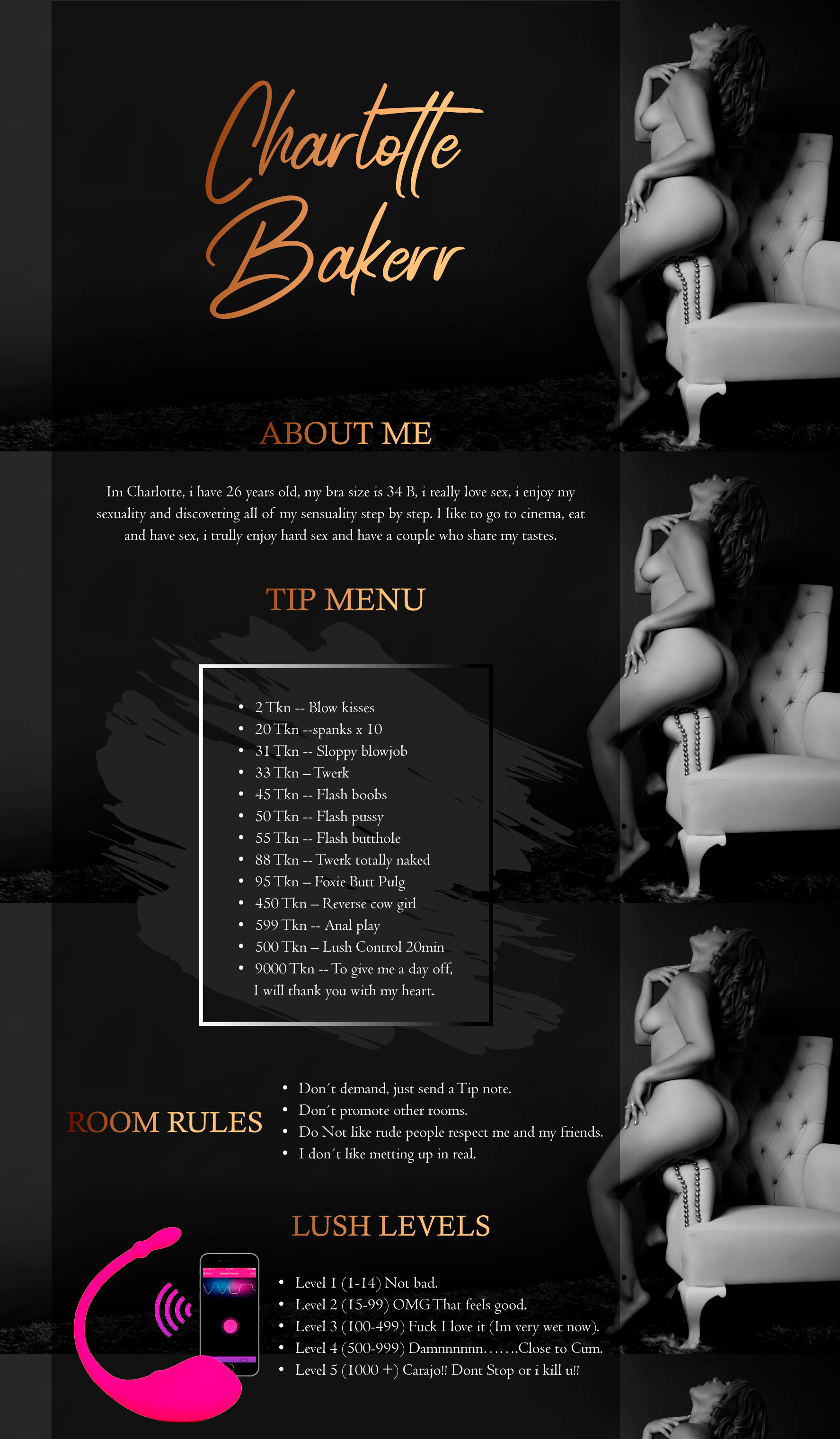 Durch Anklicken des Buttons wirst du charlotteBr für 60 Sekunden auf die erste Position auf der Hauptseite befördern. Während dieser Zeit wird der Chat-Raum des Models besser sichtbar und unglaublich populär! Ein Hinweis auf deine Aktion wird im Chat erscheinen, sichtbar für das Model und die anderen Chat-Teilnehmer. charlotteBr wird diese Geste sicher zu schätzen wissen und dir unendlich dankbar sein!