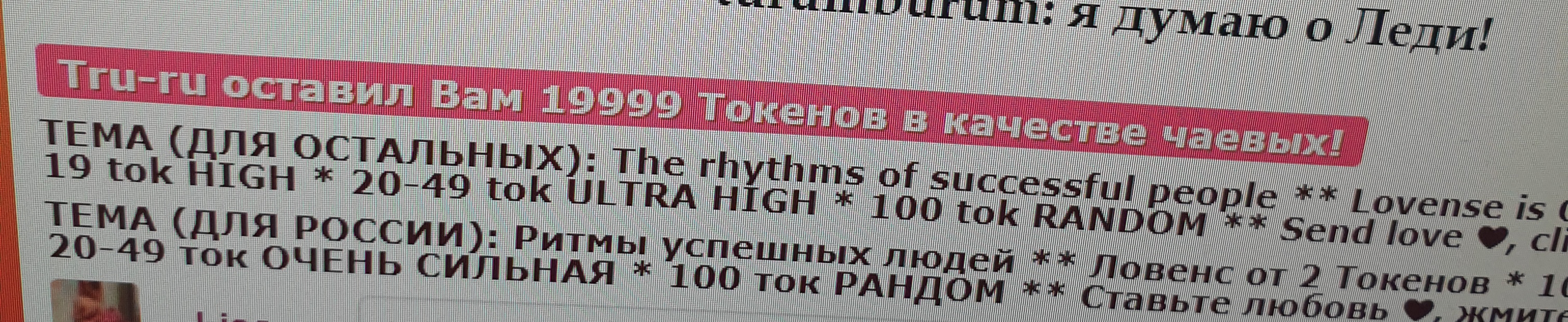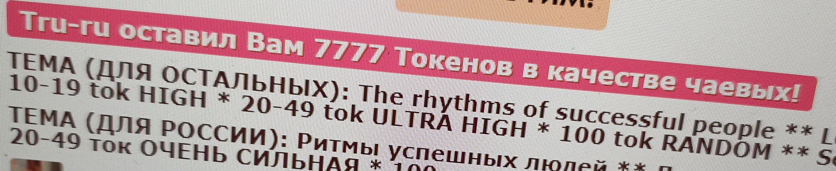 The rhythms of successful people * Vibrations start from 2 Tokens: 2, 20, 50, 200, 400-the most pleasant, 1000, 3333-OMG! Special+Domi: 100-RANDOM, 555-666-777* Masturbation replaces vaccination